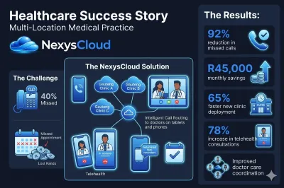 A growing medical practice with 4 clinics across Gauteng struggled with their traditional phone system. Patients experienced 40% of calls going to voicemail during peak hours, missed appointments cost the practice over R50,000 monthly, and doctors couldn't access patient calls when working between locations. Their legacy PBX system couldn't support remote consultations, and adding new clinics required expensive hardware installations taking weeks to complete.