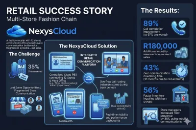 A fashion retailer with 12 stores across South Africa faced severe communication bottlenecks. Their fragmented phone systems meant 35% of customer calls never reached the right person, resulting in lost sales. Store managers couldn't communicate effectively with head office or each other, inventory inquiries required multiple transfers, and the company had no visibility into call metrics to measure customer service quality. Peak shopping periods overwhelmed individual store lines, and staffing issues at one location couldn't be quickly addressed by neighboring stores.