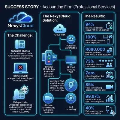 A mid-sized accounting firm with 45 employees faced a critical communication crisis during tax season. Their outdated phone system couldn't support the 60% of staff working remotely part-time, resulting in clients experiencing 48-hour callback delays and frustrated partners missing urgent calls. The firm lost 3 major clients due to poor responsiveness, costing over R400,000 in annual fees. Conference calls were unreliable, collaboration between team members was inefficient, and the firm appeared unprofessional when clients couldn't reach their assigned accountant directly.